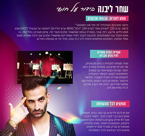 בין אם אתם מחפשים מופע קורע מצחוק, מופע בידור אינטראקטיבי או ערב גיבוש עם טוויסט הומוריסטי – אצלנו תמצאו את האמנים והמופעים המובילים בישראל!